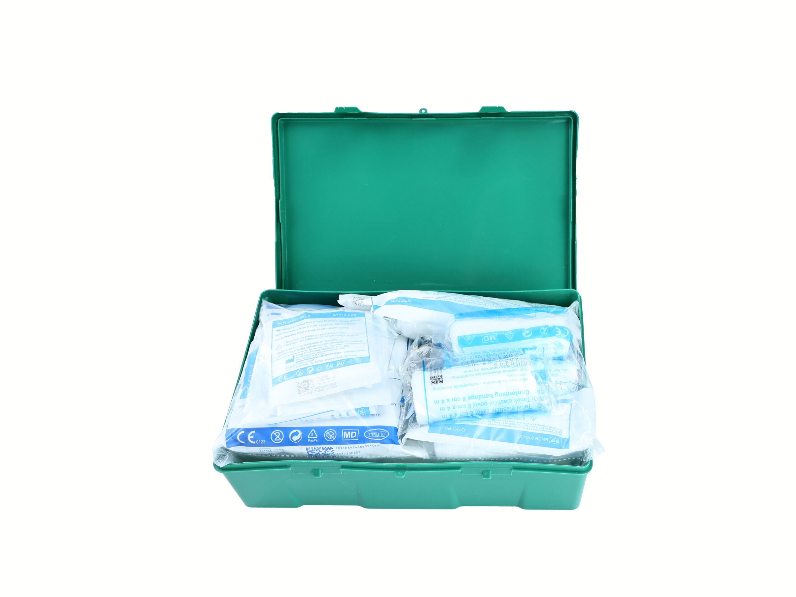 - Extras: Dreieckige Binden, anpassende elastische Bandagen, Handschuhe, Gesichtsmaske, Reinigungstücher, Müllsäcke und ein Erste-Hilfe-Handbuch.